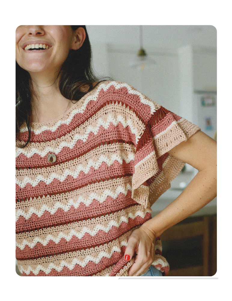 Trabalhe em malha circular com pb e pt flecha, uma variante que consiste em fazer 2 pb sobre uma C de cor contrastante (2 ou 3 C mais abaixo) para criar linhas verticais. Termine com uma C de mpa. Corte o fio na mudança de cor e esconda o secundário à medida que trabalha com o novo. As corr de viragem contam como o 1.º pt de cada C.